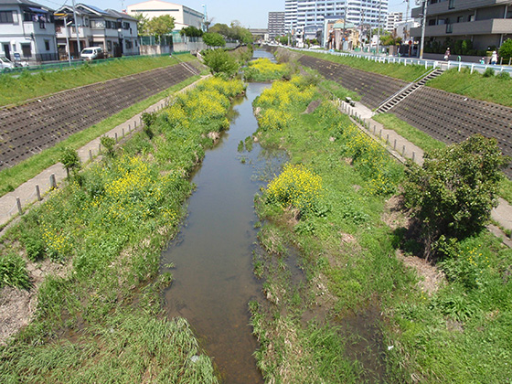 春の大正川。一見美しく見えるが、何袋ものゴミが集まる。中州に外来種のセイヨウカラシナが席巻しているのも悩ましい。