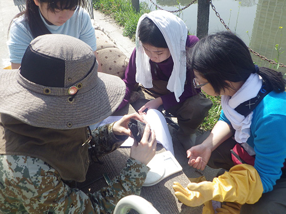 環境問題に対する理解のために、同じ大正川で活動する他団体と一緒にイベントで啓発活動をすることもありますが、今回は保全活動やカメに興味のある一般の方々に呼びかけて、通常会員が行っているルーティンの活動を体験していただきました。